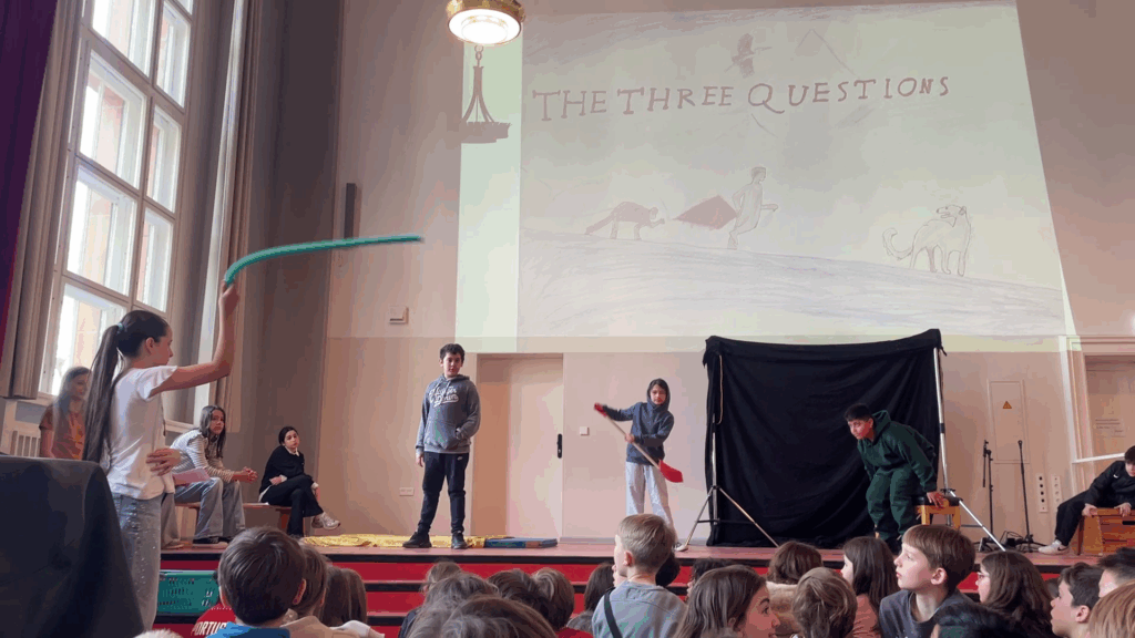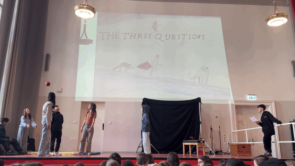 Beim Theaterstück „The three questions“ haben 16 Schüler*innen aus der 5. und 6. Jahrgangsstufe auf Englisch drei ganz große Fragen auf die Bühne gebracht. Die letzte: What is the right thing to do? – „Flying!“, antwortete der Reiher. „Fighting!“, sprach der Hund. „Having fun all the time!“, wusste der Affe. Ihr Freund Nikolai war damit nicht zufrieden und fragte Leo, die alte Schildkröte. Und dann kam der Sturm und mit ihm die instrumentale Begleitung durch Wave bead ocean drum, chimes, Heulschlauch, Klavier und Pauke. Nach drei Tagen Englisch nonstop und zwei Aufführungen in der Aula waren alle erschöpft und zufrieden.
